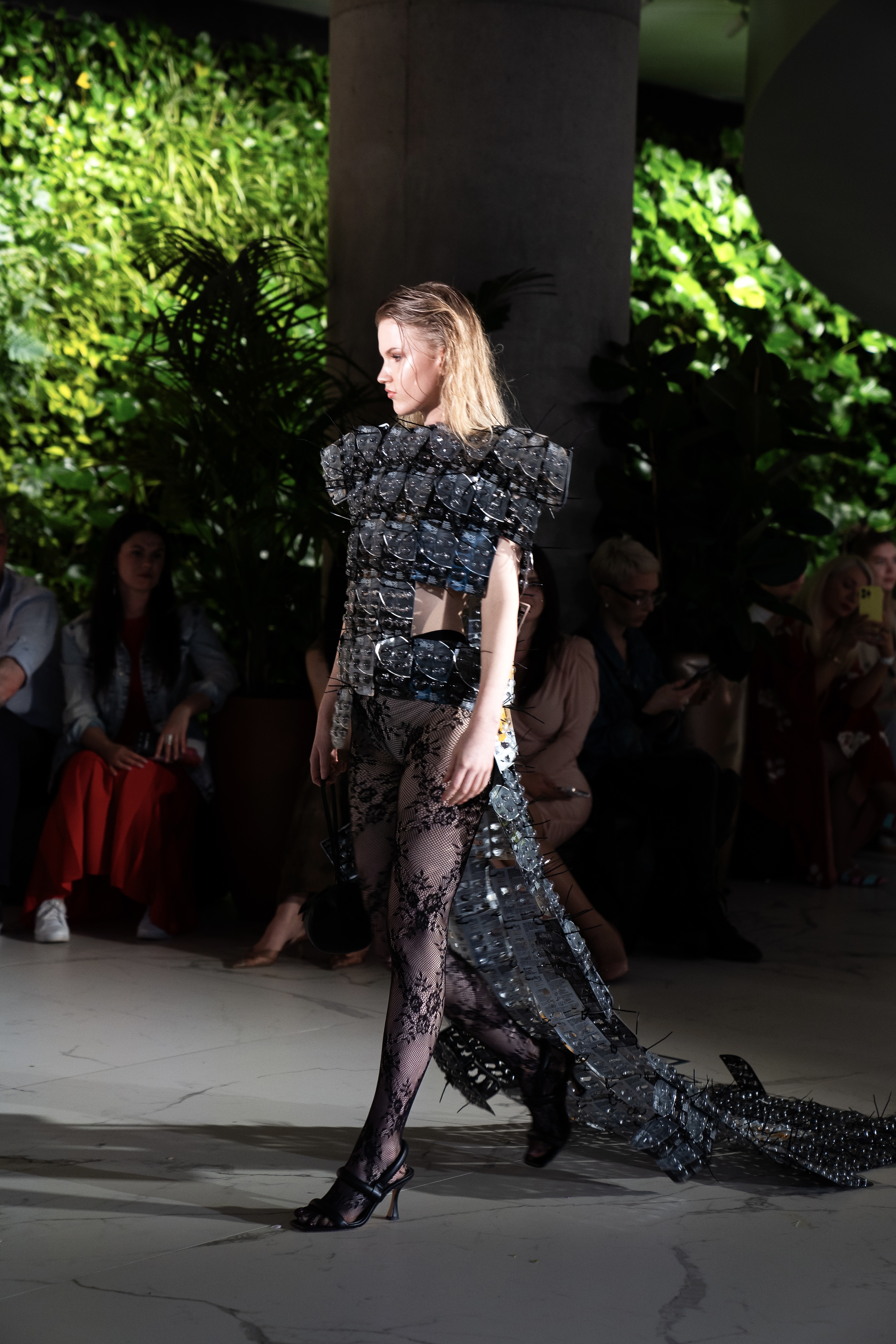 “Par vienu no galvenajiem aspektiem kļuva pārstrādāti kolekcijas audumi un ilgtspējības jautājumi. Kolekcijā iekļauti no tamborētiem vintāžas plediem darināti modeļi kombinācijā ar klasiskiem audumiem un spalvām, kas apģērbiem piešķīra vakartērpa izskatu. Par kolekcijas šova elementu kļuva avangardisks tērps, ko arī var uzskatīt par ilgtspējīgas modes objektu, kas darināts no izlietotām matos ieklājamo vitamīnu “Ellips” plāksnēm. Starp citu, šis tērps izraisīja daudz un dažādas skatītāju reakcijas, un tas arī bija mūsu mērķis – pievērst uzmanību. Vispār ļoti priecājos satikt arvien vairāk cilvēku, kas domā ilgtspējīgi un atbildīgi.”